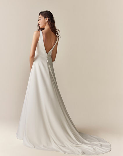 La robe 2530, appelée Celestino chez Douce Mariage, est une robe Jesus Peiro tout en crêpe fluide intemporelle et élégante, sobre et moderne.