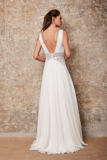 La mousseline de soie de Lorient fait son charme et sa finesse et ses détails de broderies et guipures tout en symétrie la rendent divinement sculpturale. Le dos s'assume profond, carré, sans compromettre le confort de la mariée.