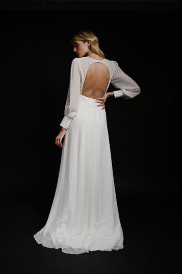 La robe Suki s'offre un magnifique tissu d'une originalité renversante : une mousseline de soie mouchetée en fil coupé. Elle reprend les codes des plus belles robes de Stéphanie Wolff, manches longues et volumineuses, drapé, taille marquée.